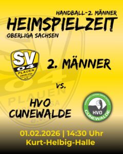 Nach der Spielverlegung des Auswärtsspiels gegen KJS Dresden am letzten Wochenende (Gegner nicht spielfähig) steht nun am Sonntag erneut ein Heimspiel für die II. Mannschaft an. Zu Gast in der Helbig-Halle ist der HVO Cunewalde. Die „Cunewalder Jungs“ kommen sicher mit einer gehörigen Portion Selbstvertrauen in die Spitzenstadt, da sie zuletzt Ihre beiden Auswärtsspiele recht erfolgreich bestritten haben (unentschieden in Aue und Sieg in Görlitz). Für die Hausherren wird es bei der Begegnung darauf ankommen, sich wieder auf Ihre kämpferischen Tugenden zu konzentrieren, mit denen sie bereits in den letzten beiden Spielen die zahlreichen Ausfälle recht gut kompensieren konnten. Neben der noch weiter angespannten Personalsituation wird auch ein Rückblick auf das Hinspiel, bei dem man nach einem vermeintlich sicheren Vorsprung von bis zu 7 Toren noch eine Punkteteilung hinnehmen musste, die Schwarz-Gelben nochmals zu höchster Konzentration und maximalen Einsatz mahnen. Es wird somit spannend zu sehen, wie die Plauener mit dieser Aufgabe umgehen werden, da selbstverständlich die beiden Punkte in Plauen bleiben sollen. Hierbei kommt es nun mehr denn je auf die Unterstützung von der Tribüne an um den um den Jungs den notwendigen Rückhalt zu geben. Also unbedingt vormerken: Sonntag 14:30 Uhr Helbig-Halle und zur optimalen Einstimmung aufs EM-Finale die II. Mannschaft zum Erfolg pushen.